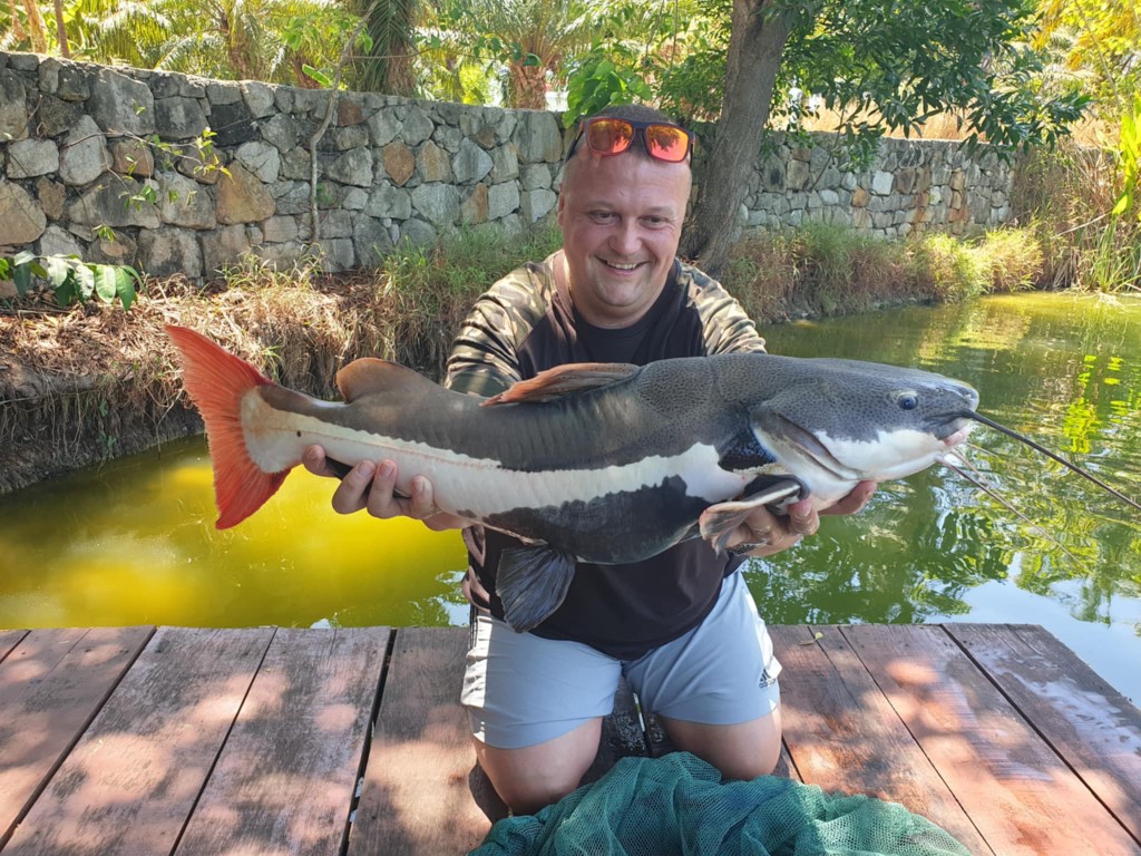 Jeśli chodzi o przynęty to stosowałem pop up kulkę,zanętę sypką a po jakimś czasie miejscowi Tajowie przynieśli wątróbkę, po której zaczęło się mega dużo brań. Na początku Tajowie byli bardzo tajemniczy, nie podpowiadali jak i co się z czym je , miałem bardzo dużo spinek. Po czasie dali mi wskazówki jak te ryby wyciągać do brzegu.Pierwszą rybe jaką udało mi się złapać był sum czerwono płetwy - ryba wyglądała obłędnie. Następną rybe jaką udało mi się wyholować do brzegu była to ryba niszczuka. Bardzo bardzo waleczna ryba, można tu porównać do porządnego polskiego szczupaka, takiego 120 cm ale o sile suma 2 metrowego.Ta ryba wyskakiwała nad wodę robiąc mega świece ,kiedy udało mi się przyholować tego potwora do brzegu na pomoc ruszyło dwóch opiekunów tego łowiska.Założyli rękawice oraz zarzucili koc na niszczukę,wszystko po to aby ryba nikogo nie ugryzła.
